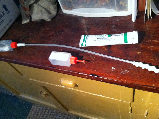 That long, catheter-like thing with the spiral on the end went all the way in her with maybe 2 inches to spare. The tube of stuff is lubricating jelly and the container with the red lid is the semen. The Label reads Speed Dial. Poor Roxie, never even got to meet Speed Dial. Here's a picture of him. I think he's pretty awesome looking.